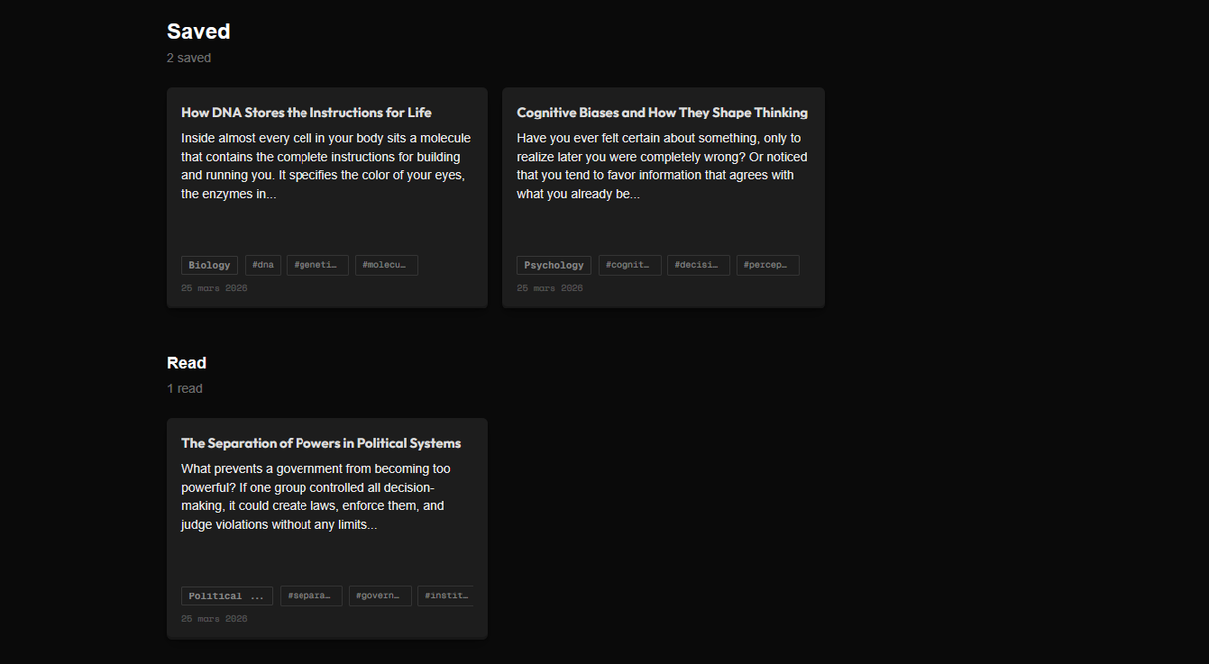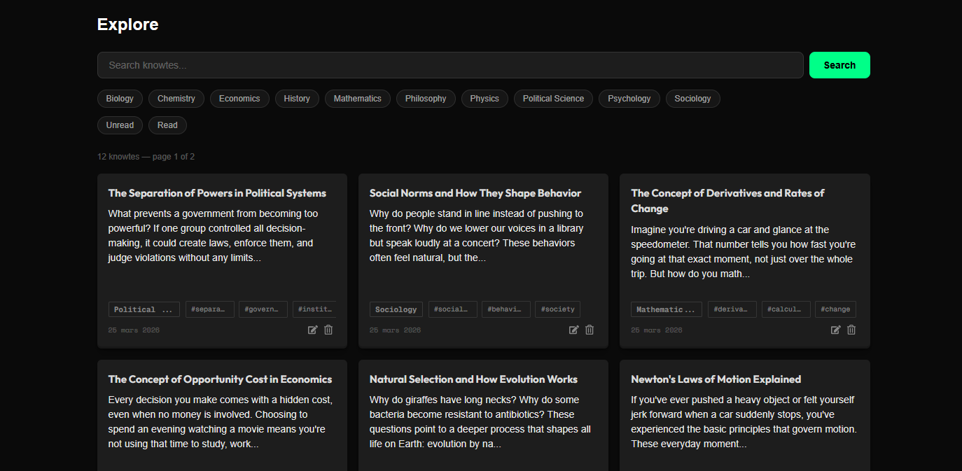 A micro-learning platform designed to make learning fast and frictionless. Instead of long articles or full courses, Knowtes delivers short, self-contained explanations of single concepts, each readable in under five minutes, with no assumed knowledge or unnecessary filler. Users explore a curated feed of topics, mark what they’ve read, and build a personal knowledge network that visualizes how concepts connect over time. The result is a growing, interactive map of what you’ve actually learned. Built with Next.js, React, TypeScript, and Supabase, the platform focuses on simplicity, clarity, and high-quality content, solving the problem of overwhelming information by making learning quick, structured, and tangible.